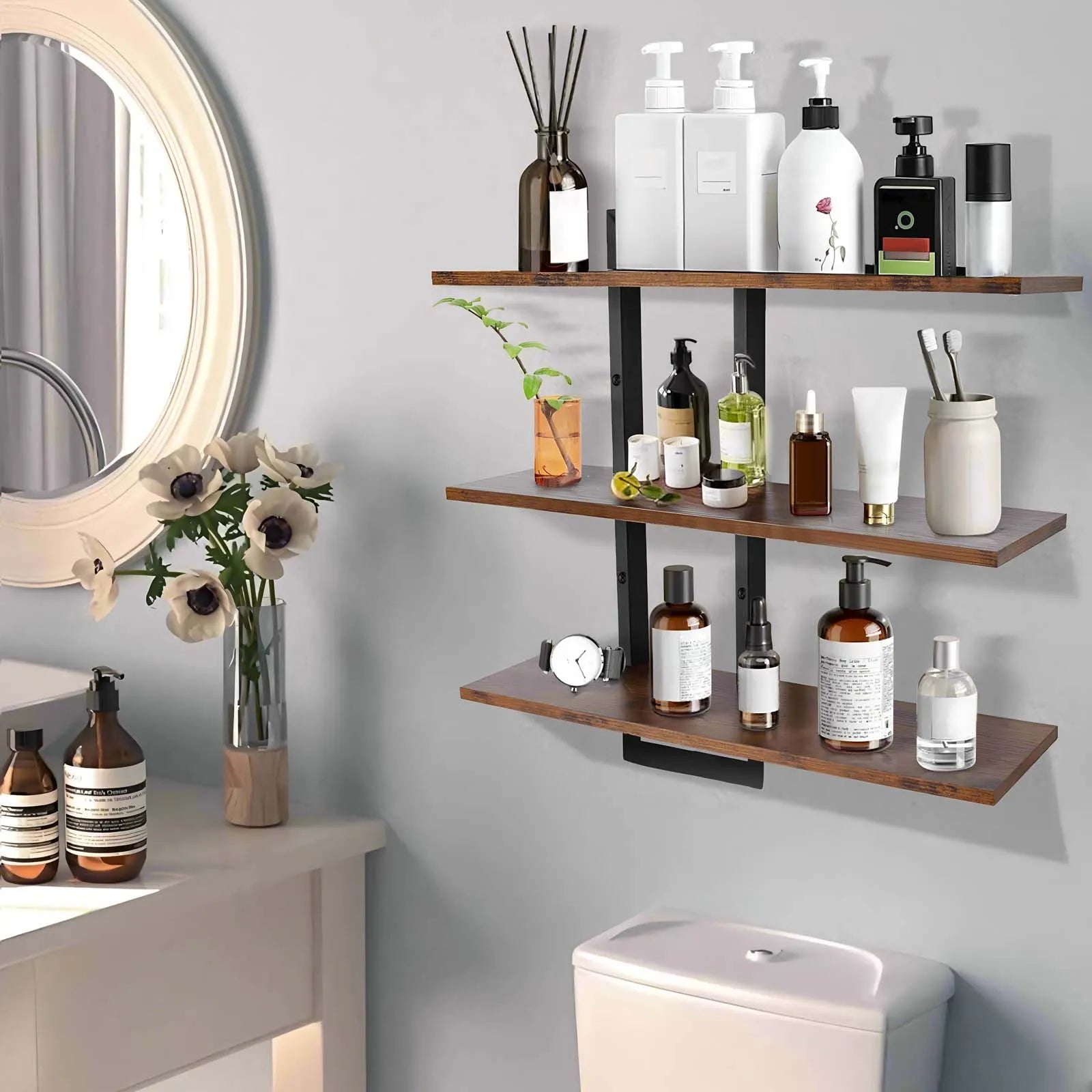 3-Tier Wall Mounted Floating Wood Shelves for Living Room Bedroom Bathroom Storage Organizer Rack